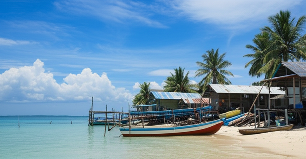 • Desa nelayan di tepi laut, perahu tradisional, suasana damai.