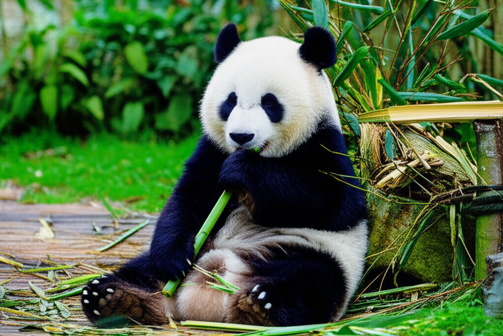 A majestic giant panda sitting peacefully, eating fresh bamboo shoots in a dense, lush green bamboo forest. Soft morning sunlight filters through the canopy, creating dappled light on the forest floor. Photorealistic, ultra-detailed, 8k, cinematic shot, natural light, shallow depth of field.